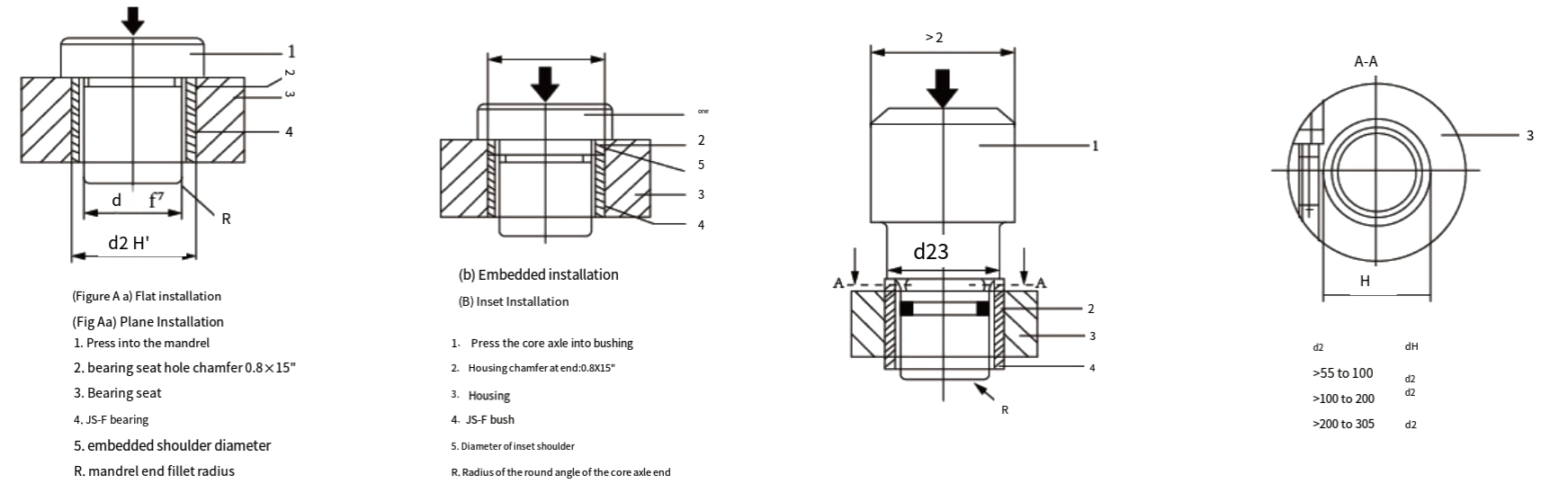 Untuk semak (diameter luar<55mm), tekan semak ke dalam wadahnya dengan hati-hati dan hati-hati menggunakan poros inti dengan pegangan.GbrA.